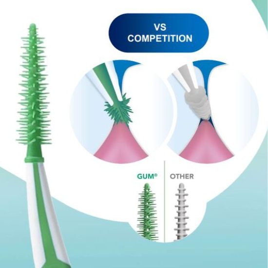 De GUM Soft-Picks PRO Small beschikken namelijk over een dichte massa van rubberen borstelharen. Deze zijn strategisch geplaatst om een breder oppervlak te dekken. Dankzij de nieuwste klinische onderzoeken weten we nu dat de GUM Soft-Picks PRO de reinigingsefficiëntie met meer dan 50% verbetert*, wat hem tot een essentieel hulpmiddel maakt in de mondverzorgingsroutine.