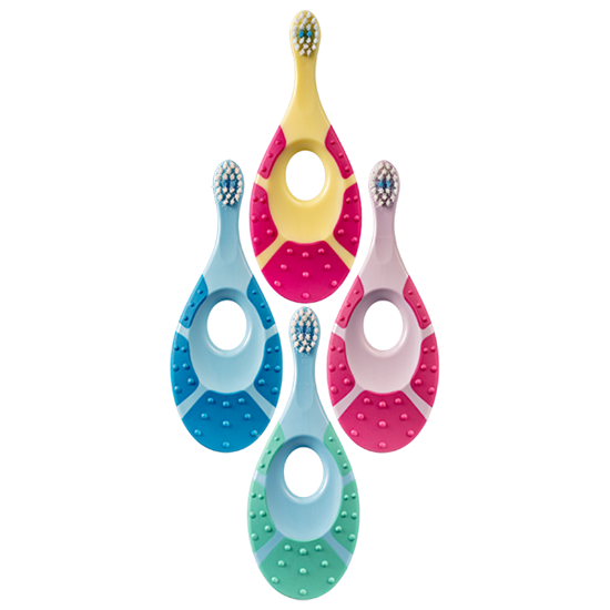 Omdat het tandvlees vaak erg jeukt als de tandjes doorkomen, is de Step by Step tandenborstel zo ontworpen dat het handvat ook kan fungeren als bijtring. De tandenborstel is geen speelgoed, laat uw kind er alleen onder toezicht gebruik van maken.