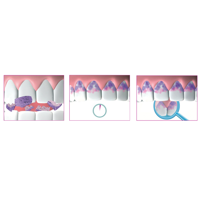 Bij het innemen van een tandplakverklikker, verkleuren de gedeeltes waar tandplak op zit. Dit is natuurlijk wel even grappig om te zien in de spiegel. Blauwe of roze gedeeltes op de tanden. U wilt hier natuurlijk zo weinig mogelijk van terugzien. Dit wil alleen maar zeggen dat er veel tandplak heeft opgestapeld.