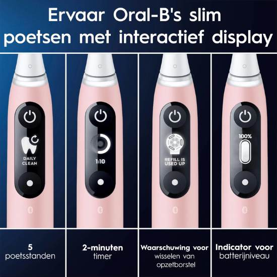 Op het display kiest u met één druk op de knop de stand die u wilt gebruiken. U ziet tijdens het poetsen een timer die u bij de les houdt. En als het tijd is om de opzetborstel te vervangen, krijgt u daar vanzelf een melding van. Via Bluetooth kunt u de tandenborstel koppelen met de Oral-B app, die in realtime laat zien waar u wel en niet bent geweest. Vooral mensen die snel plekken overslaan, merken dat hun routine zichtbaar verbetert. De Oral-B iO roze uitvoering maakt uw badkamer net wat gezelliger. Klein detail, groot plezier.