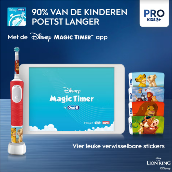 Met de Disney Magic Timer-app erbij is poetsen geen plicht meer, maar een spelletje. Twee minuten vliegen voorbij terwijl het scherm volloopt met Lion King-figuren. Kinderen poetsen ongemerkt langer en beter, zonder dat u hoeft te zeuren. De Oral-B Kids 3+ Lion King maakt poetsen leuker, zachter en grondiger. Wie eenmaal poetst met een Oral-B Lion King tandenborstel, wil nooit meer terug naar een gewone handborstel.