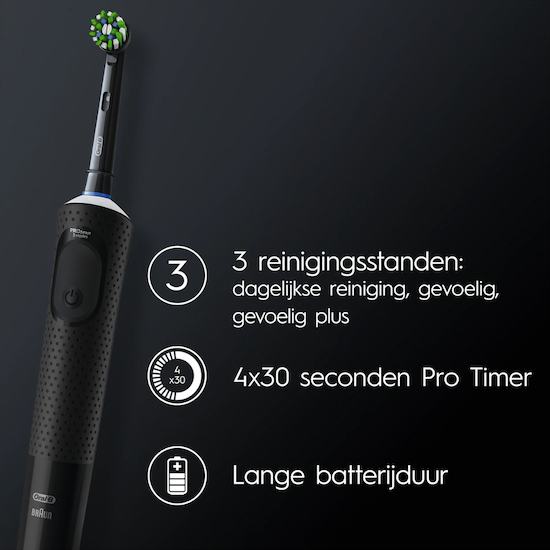 De Oral-B Vitality PRO Black elektrische tandenborstel combineert kracht en zachtheid op een manier die u niet snel bij andere modellen vindt. Gebruik de Cross Action opzetborstel voor een intensieve reiniging of de Sensitive Cleanvoor een milde poetsbeurt. In beide gevallen worden uw tanden grondig gereinigd en blijft uw tandvlees gezond.