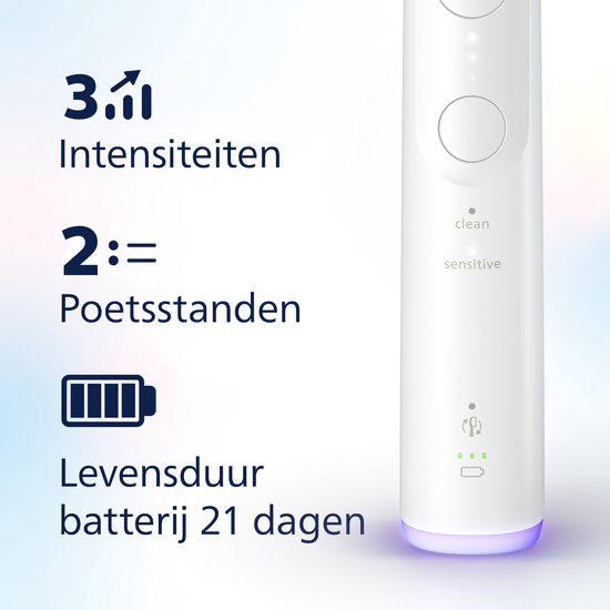 Altijd de juiste stand, zonder twijfel. De sonicare 7100 beschikt over vier poetsstanden: Clean, White, Sensitive en Gum Health. Elke stand kan worden gecombineerd met drie intensiteitsniveaus. Zo stemt u de poetsbeurt af op uw behoefte van dat moment. Een frisse start in de ochtend. Of juist een zachte reiniging voor het slapengaan.