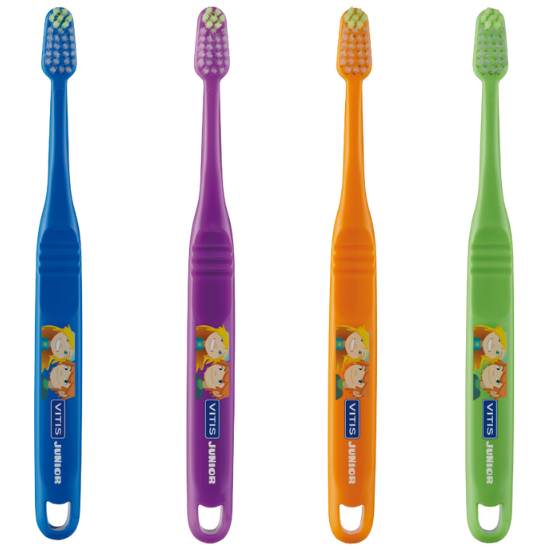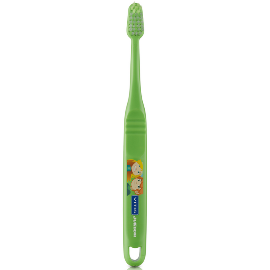 De Vitis Junior Tandenborstel is zo samengesteld dat het perfect aansluit bij de behoeften van een kindergebit. De borstelharen zijn zacht en flexibel en hierdoor ook zacht voor het gebit. De borstelkop van de Vitis Junior Tandenborstel is extra klein, waardoor hij zeer geschikt is voor het kleine kindergebit. Het ergonomische ontwerp met een dikker handvat met smalle nek past precies in een kinderhand. Daarnaast heeft het handvat anti-slip groeven, waardoor het kind nog meer controle heeft over de tandenborstel.